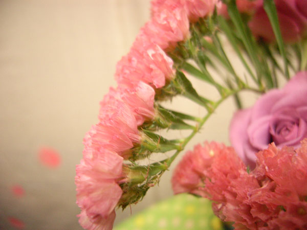ちいさな薄ピンクの花を買いました。おまけでガーベラとバラを付けてくれました!